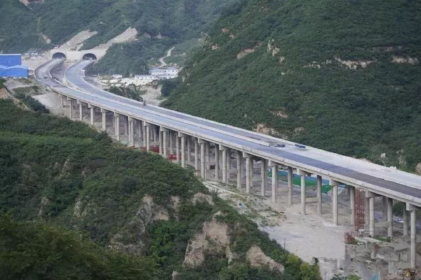 据悉,全线桥梁总面积约40万平方米,隧道总长度(单洞)32844米。在这其中,全长2600多米的白羊沟特大桥和1200多米的梯子峪隧道也是极具挑战的重点控制性工程。